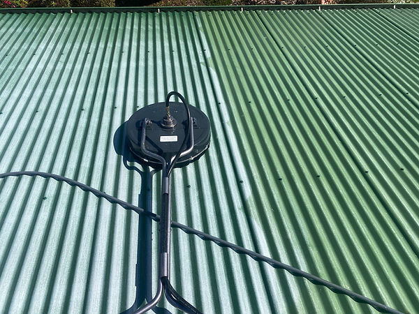 The photo on the left is a roof that I pressure washed in December 2024 in preparation for painting as the paint had faded and new solar panels were to be installed shortly.
